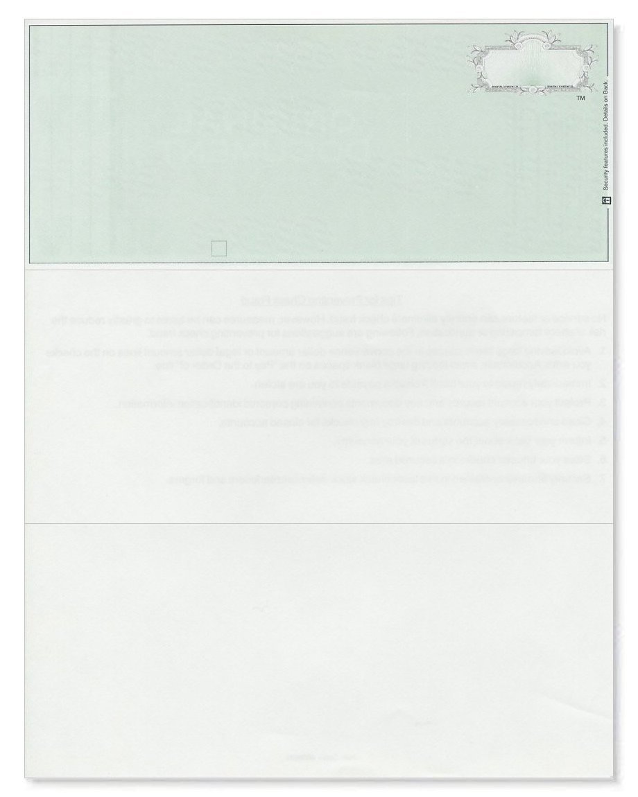 These business size checks were designed exclusively for Check Launch. They contain a complex seal for encrypted check information, authentic watermark and micro print, erasure and chemical stain protection and many more security features. Sheets are 8 ½” x 11” and perforations at 3 2/3" each (all equal sized sections). These are blank checks, your software must be able to print MICR encoding.